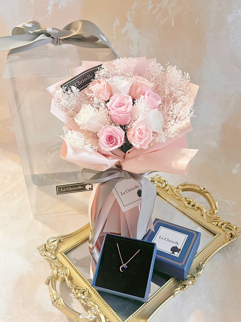 頸鏈套裝 (情人節預訂) *迷你*版天長地久9枝3色保鮮玫瑰花束 永生花 Le Petit Forever Love Preserved Rose Flower Bouquet
