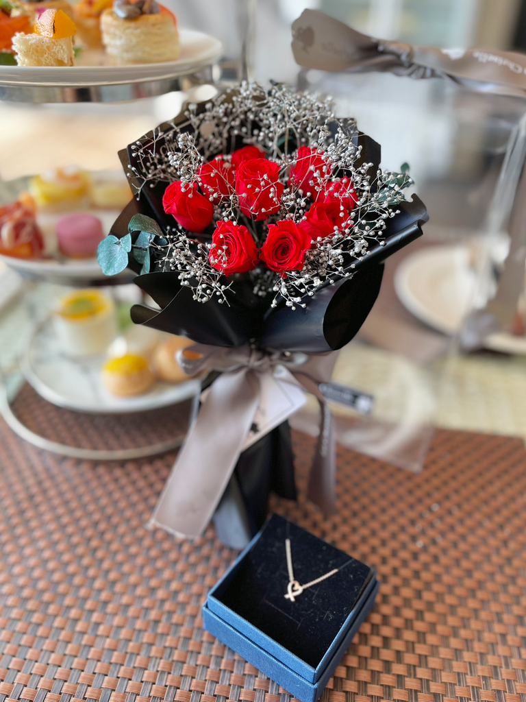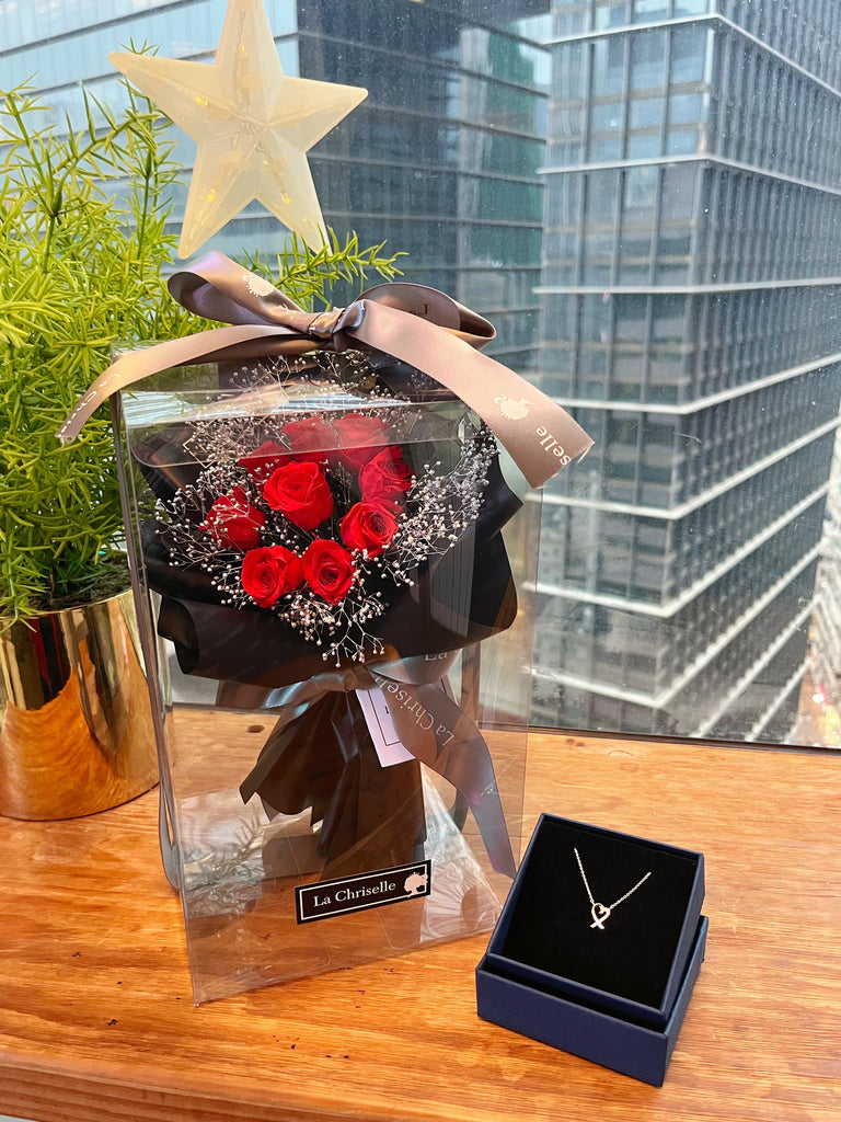 頸鏈套裝(情人節預訂) 迷你版天長地久9枝紅色保鮮玫瑰花永生花束 + 頸鏈 Le Petit Forever Love Preserved Red Rose Flower Bouquet