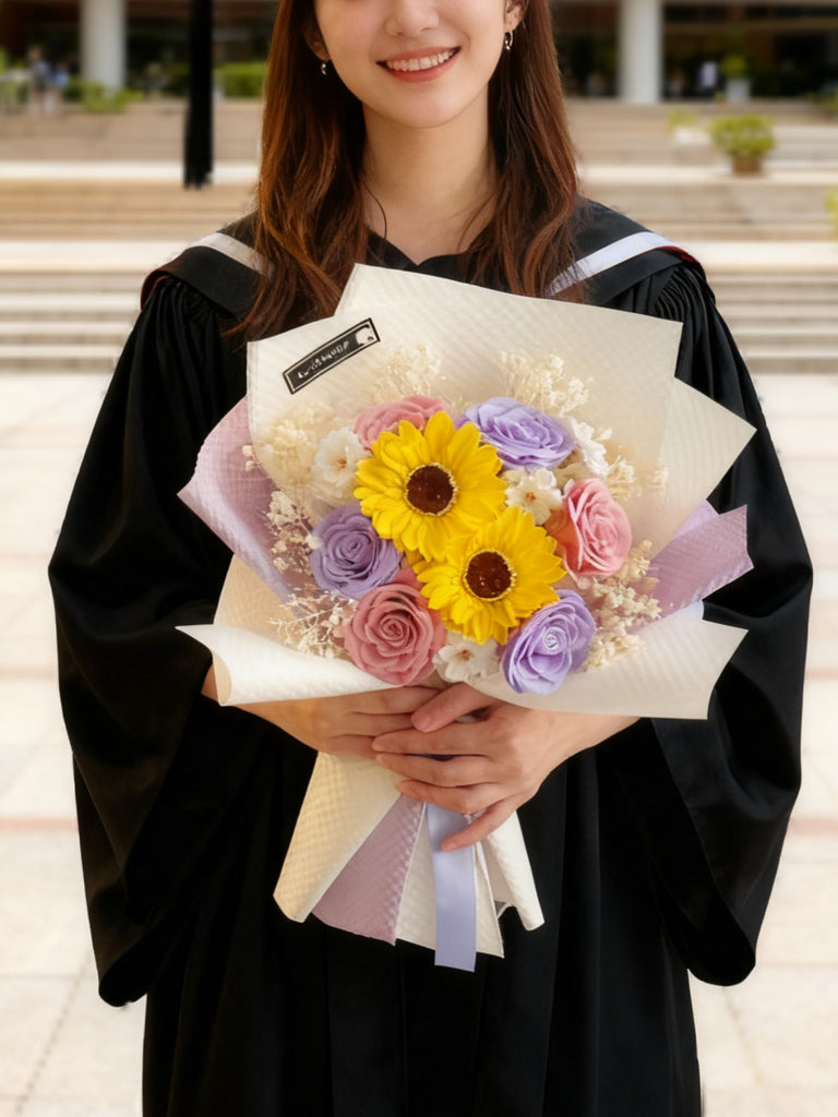 (番梘花)柔美-畢業花束系列—太陽花 玫瑰花 乾燥花束
