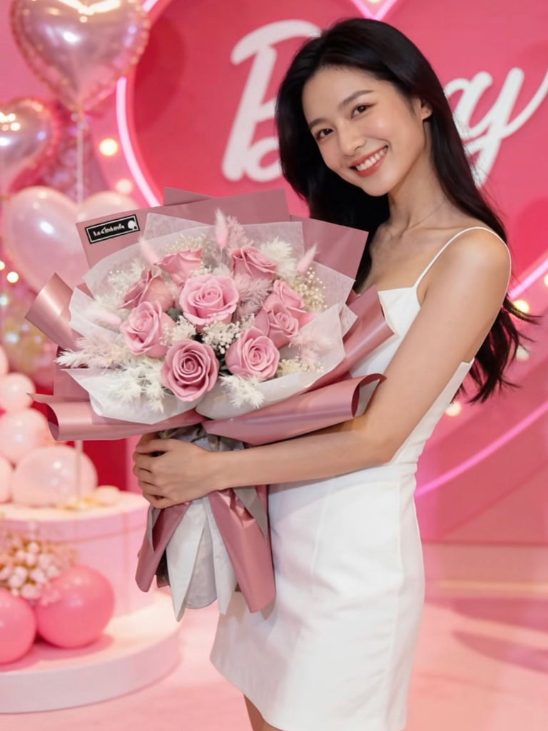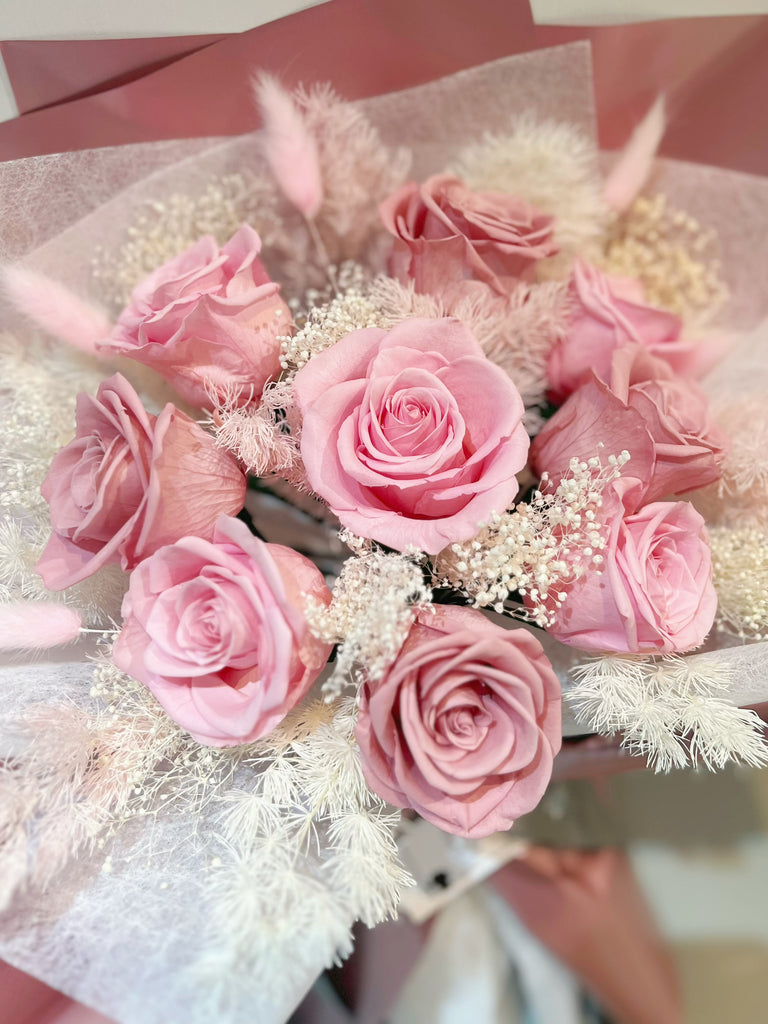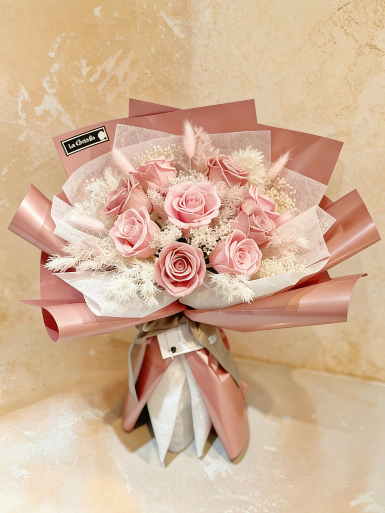 天長地久 9 枝粉紅豆沙色系保鮮玫瑰花束|保鮮花 永生花生日花束6pink preserved rose bouquet
